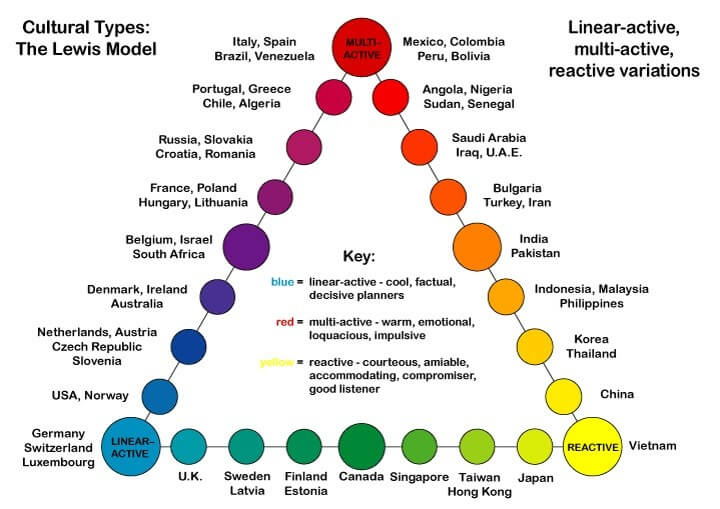 It is also important to acknowledge that negotiation and conflict behaviours are shaped by culture. The Lewis Model of Cultural Types reminds us that different cultures bring different approaches to conflict and communication.